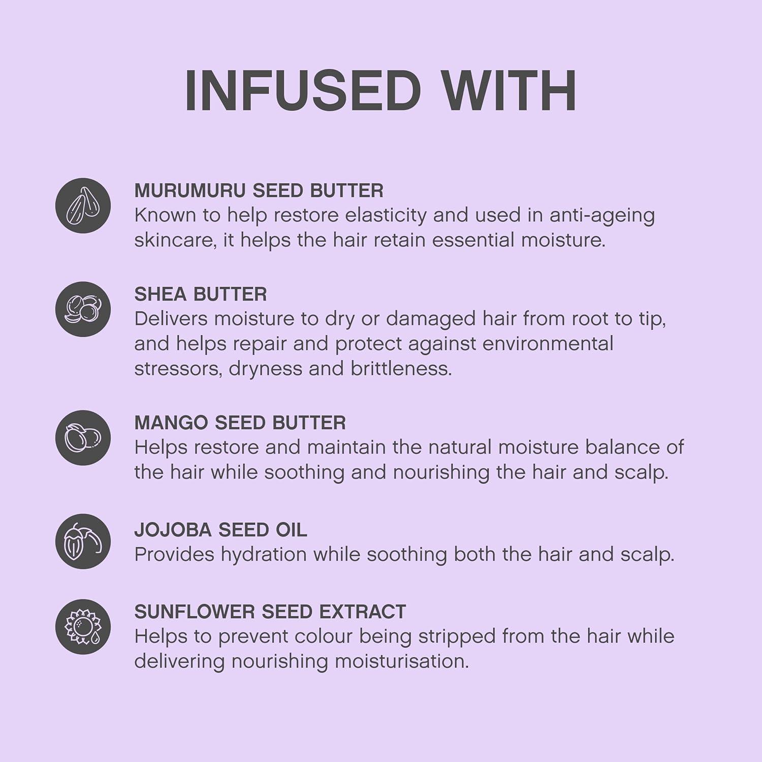 -Contains vitamin-rich murmuru butter, Shea Butter & Mango seed butter. -Helps improve hair elasticity & adds shine. -Blended with lavender flower for moisturizing, cleansing & balancing benefits.