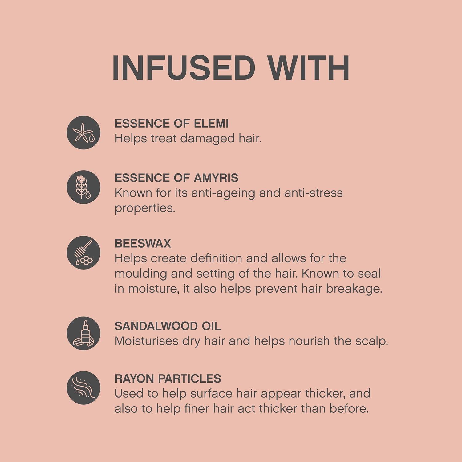 -Infused with essential oil of amyris and elemi, this weightless lotion will thicken hair, providing natural movement and body. -Rayon particles create a thicker surface making fine hair act thicker. -Natural movement and body, paraben and sulphate free, thickening, fortifying, strengthens hair, volumising.