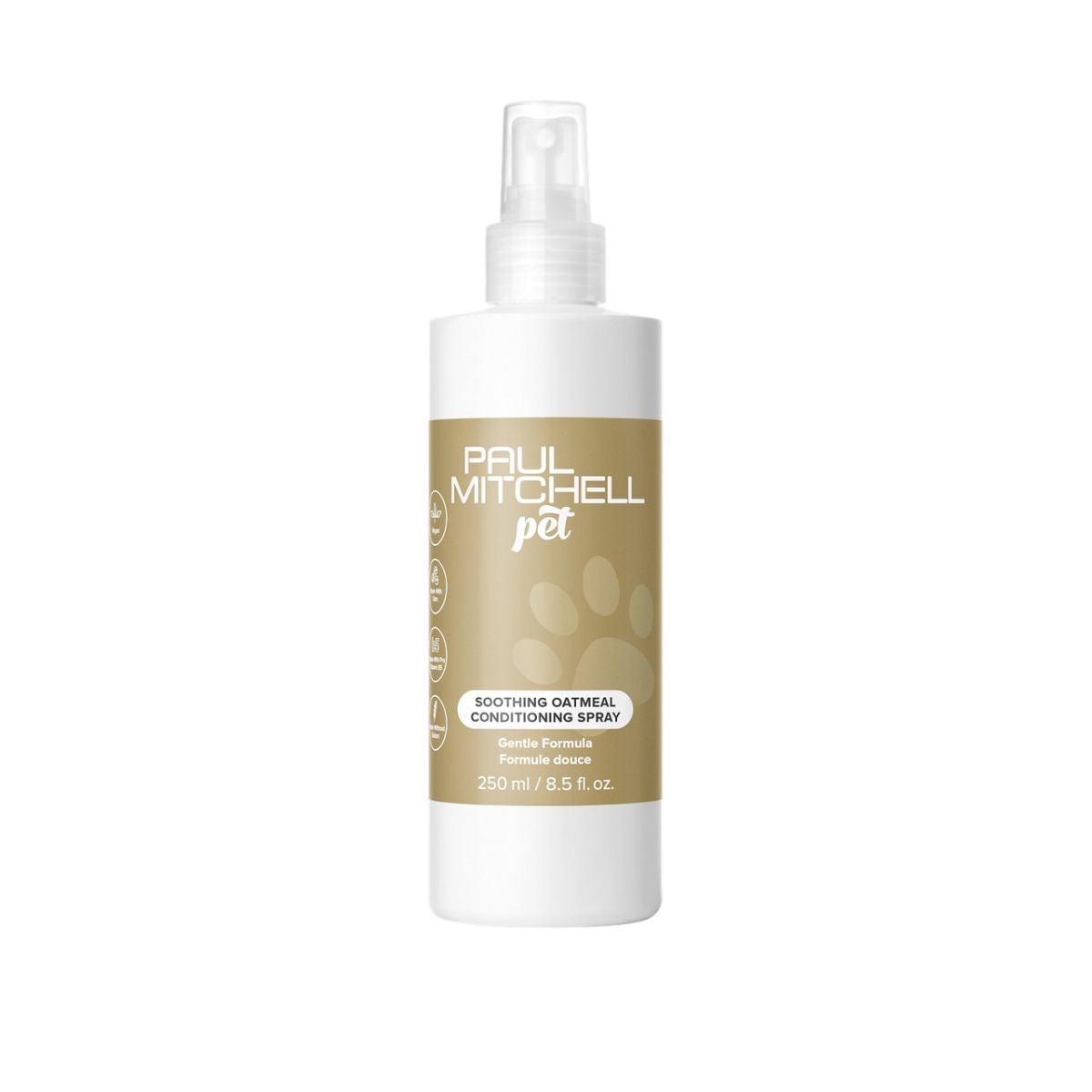 Paul Mitchell's Pet Soothing Oatmeal Conditioning Spray is specially formulated to hydrate and soothe sensitive or irritated pet skin. Its conditioning formula helps detangle fur while restoring moisture for a soft, healthy coat. Enriched with colloidal oatmeal, it calms redness and itching, making it perfect for daily care or after bathing. The light, non-greasy spray absorbs quickly, leaving a fresh, natural finish to your pet’s fur.