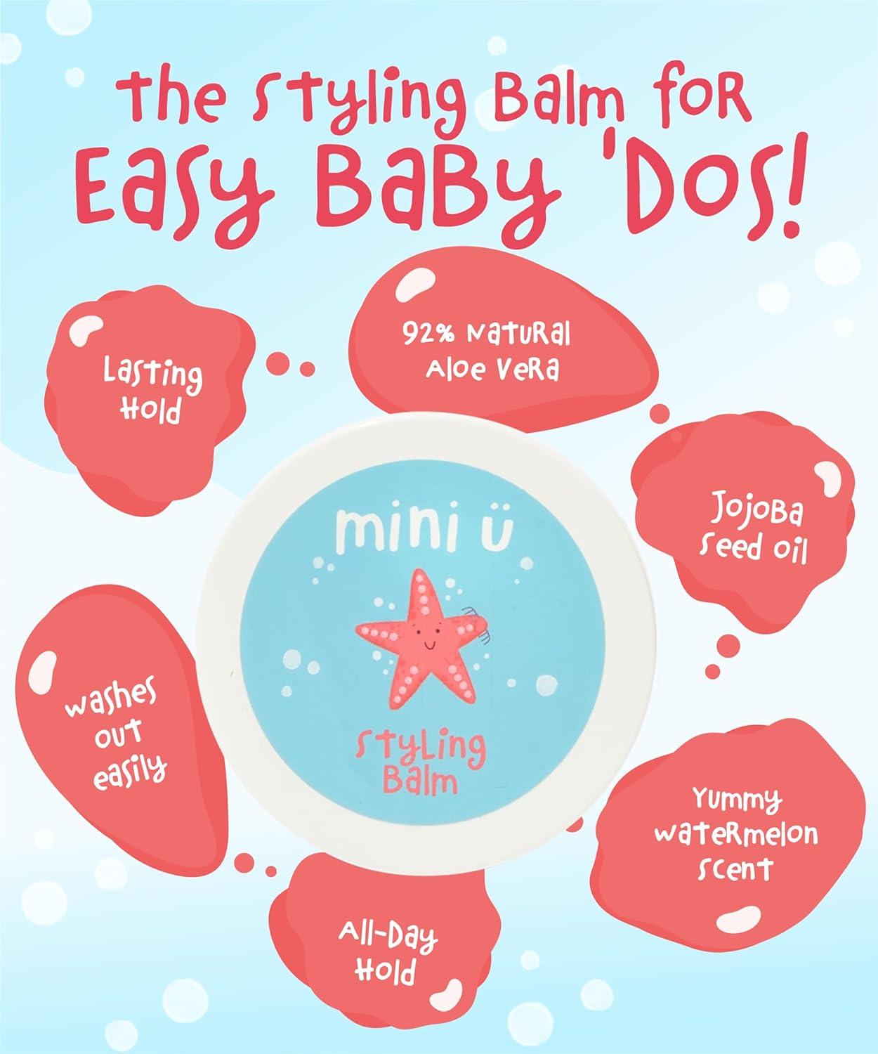 Hair styling balm for little boys and girls by Mini U, with added jojoba seed oil and aloe vera leaf juice powder. Shape and style your little one's hair with the conditioning balm with a strong, long-lasting hold that washes out easily. It has a light, fresh fragrance.