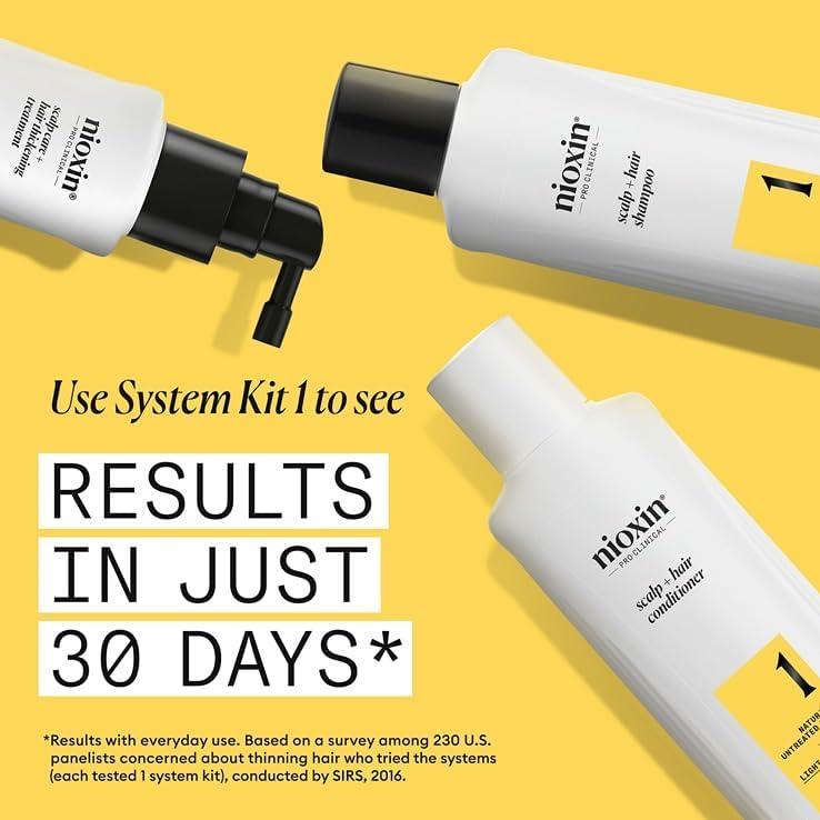 Introducing the Nioxin System 1 Trial Kit, a game-changer for your hair care routine. Say goodbye to thinning and lifeless hair and hello to voluminous locks that make heads turn. With Nioxin System 1, you can revolutionize your hair care regimen like never before. This trial kit is carefully formulated to address the needs of noticeably thinning, fine hair. Get ready to experience the transformation as your hair becomes stronger, thicker, and more resilient. Thickening Action: System 1 is designed to amplify hair texture and create a fuller, more voluminous look. Deep Cleansing: This powerful cleanser eliminates excess sebum and impurities that can hinder hair growth. The Nioxin System 1 Trial Kit is enriched with a unique blend of botanicals and antioxidants that nourish your hair from root to tip, promoting growth and preventing breakage. Each use leaves your hair feeling refreshed and incredibly easy to manage. This easy-to-follow three-step system includes a cleanser, scalp therapy, and scalp treatment. The cleanser gently washes away impurities, while the scalp conditioner provides essential nutrients to the scalp, creating the ideal foundation for hair growth. Finish with the scalp treatment to protect vulnerable areas and add volume for that enviable, bouncy look. Don't let thinning hair hold you back from feeling confident and beautiful. Join the thousands of satisfied customers who have experienced the remarkable benefits of Nioxin System 1. Upgrade your hair care routine today and embrace the stunning hair transformation that awaits you!